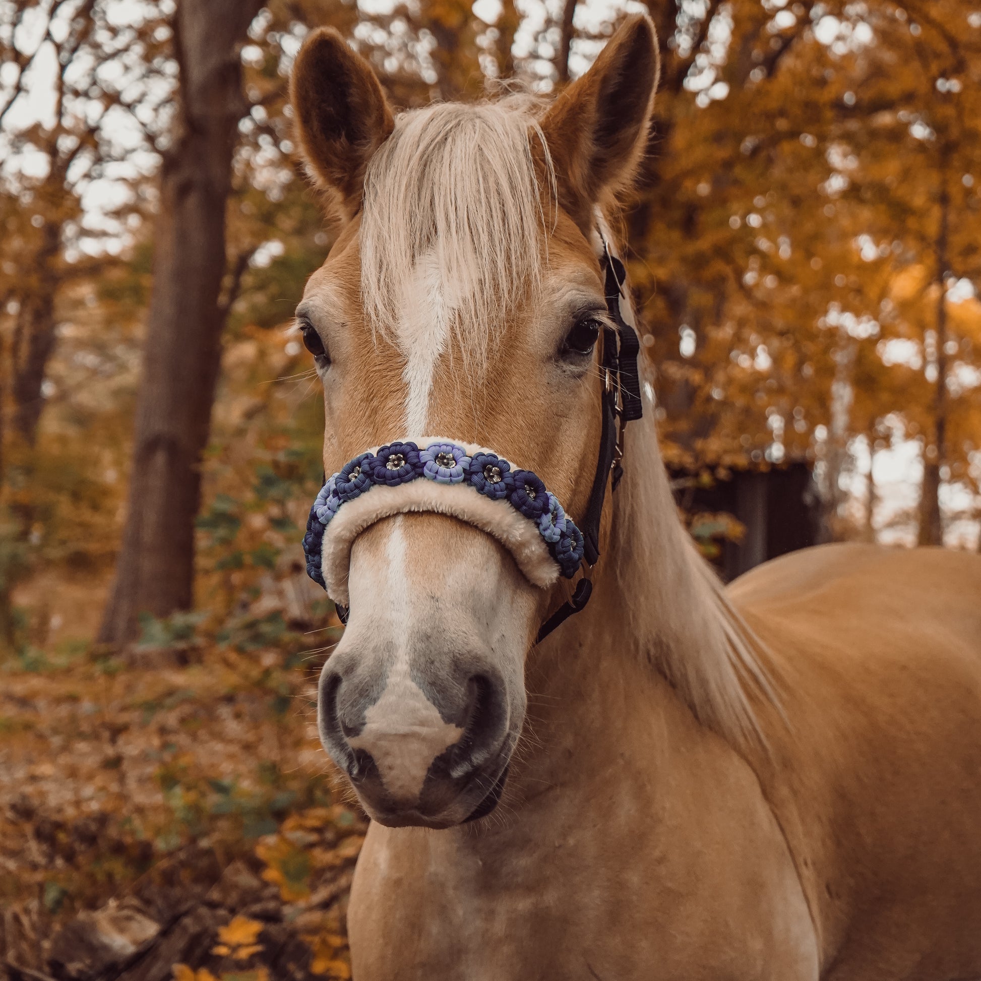 Blumen Halfter – Schwarz/Blau mit Teddyfleece (wechselbar)