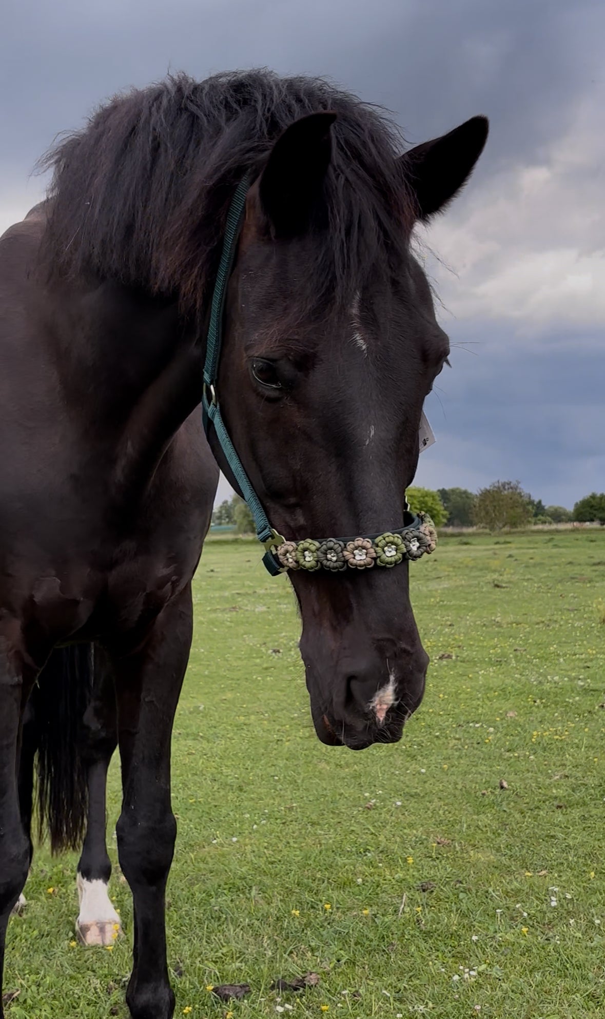 Blumen Halfter Green Lake Warmblut, Pferdehalfter Fleece, Paracord Halfter grün, Handarbeit silberne Beschläge, Pama Pferdehalfter Blumen.
