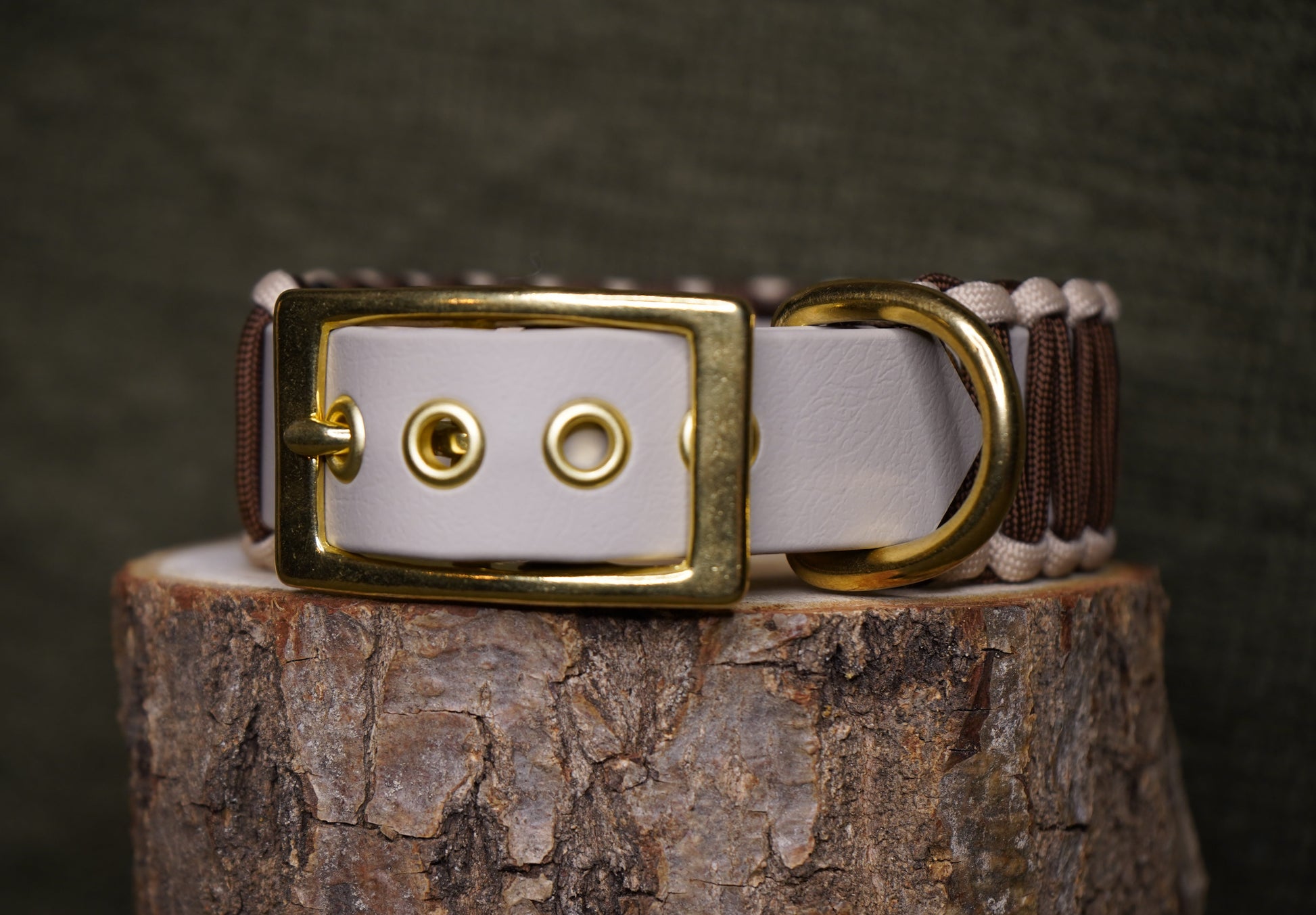 Dieses Halsband kombiniert Biothane® mit 5 verstell löchern in Beige mit selbstwählbaren Beschlägen (Empfohlen farblich passend in Gold (Messing)) sowie einer Paracord-Farbkombination aus Braun und Beige. Das Halsband eignet sich ideal für kleine bis große Hunde.